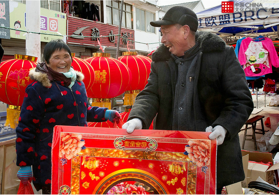 2018年2月3日拍攝于江蘇省沭陽縣。新春佳節(jié)即將來臨,當(dāng)?shù)厝罕娫诖郝?lián)市場選購自己喜愛的春聯(lián)及新年裝飾掛件,高高興興迎接農(nóng)歷新年的到來。