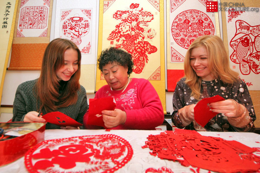 2015年1月15日,山東煙臺,外國留學生學習剪窗花,迎接新春的到來。[攝影:唐克]
