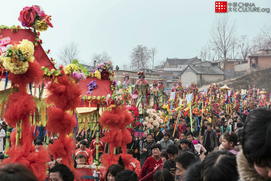 2018年3月3日拍攝于河南省南陽南召縣南河店西溝村。這里每年正月十六都要舉行社火表演;豫北叫"背閣",南河店叫"古飾",裝扮好的小姑娘叫古飾女。能夠被選上參與社火表演是件很光榮的事,家里的小孩子被選中演社火,會被認為有出息,是全家人的光榮,所以當?shù)厝斯膭詈⒆訌男【毩曂嫔缁?,世代傳承。每年正月十六,三里五村的鄉(xiāng)親們都來看“古飾”。[攝影:孟范中]