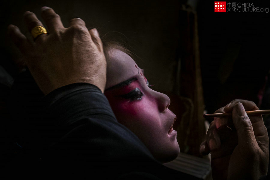 2018年3月3日拍攝于河南省南陽南召縣南河店西溝村。這里每年正月十六都要舉行社火表演;豫北叫"背閣",南河店叫"古飾",裝扮好的小姑娘叫古飾女。能夠被選上參與社火表演是件很光榮的事,家里的小孩子被選中演社火,會被認為有出息,是全家人的光榮,所以當?shù)厝斯膭詈⒆訌男【毩曂嫔缁穑来鷤鞒?。每年正月十六,三里五村的鄉(xiāng)親們都來看“古飾”。[攝影:孟范中]