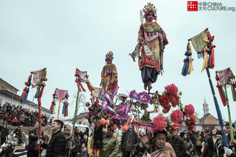 2018年3月3日拍攝于河南省南陽南召縣南河店西溝村。這里每年正月十六都要舉行社火表演;豫北叫"背閣",南河店叫"古飾",裝扮好的小姑娘叫古飾女。能夠被選上參與社火表演是件很光榮的事,家里的小孩子被選中演社火,會被認(rèn)為有出息,是全家人的光榮,所以當(dāng)?shù)厝斯膭?lì)孩子從小練習(xí)玩社火,世代傳承。每年正月十六,三里五村的鄉(xiāng)親們都來看“古飾”。[攝影:孟范中]