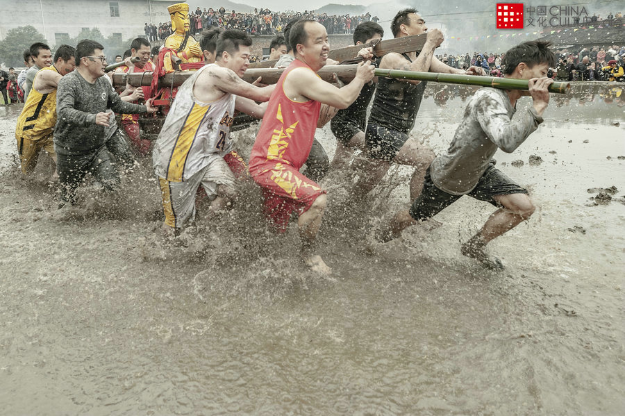 2019年2月15日,拍攝于福建省長(zhǎng)汀縣。鬧春田是福建龍巖長(zhǎng)汀縣童坊舉林村特有的,相傳上百年的習(xí)俗,每年的村民都會(huì)把關(guān)公的塑像抬到泥田里,奔跑打轉(zhuǎn),祈求新的一年里五谷豐登,同時(shí)也借此增進(jìn)村民間的感情。同時(shí)展示村民強(qiáng)健的體魄體,并以此提醒人們,要下田開(kāi)始新一年的創(chuàng)業(yè)了。[攝影:唐明珍]
