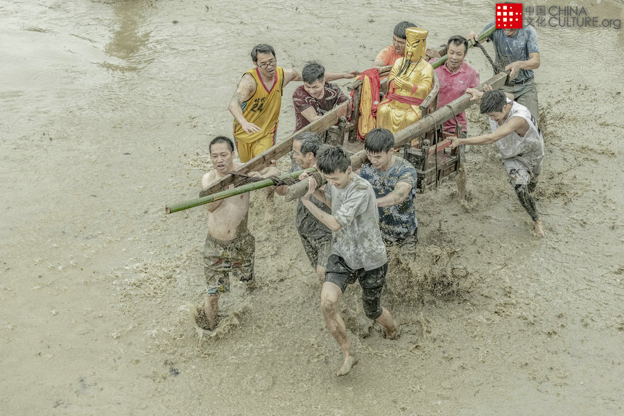 2019年2月15日,拍攝于福建省長(zhǎng)汀縣。鬧春田是福建龍巖長(zhǎng)汀縣童坊舉林村特有的,相傳上百年的習(xí)俗,每年的村民都會(huì)把關(guān)公的塑像抬到泥田里,奔跑打轉(zhuǎn),祈求新的一年里五谷豐登,同時(shí)也借此增進(jìn)村民間的感情。同時(shí)展示村民強(qiáng)健的體魄體,并以此提醒人們,要下田開(kāi)始新一年的創(chuàng)業(yè)了。[攝影:唐明珍]