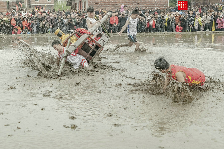 2019年2月15日,拍攝于福建省長汀縣。鬧春田是福建龍巖長汀縣童坊舉林村特有的,相傳上百年的習(xí)俗,每年的村民都會(huì)把關(guān)公的塑像抬到泥田里,奔跑打轉(zhuǎn),祈求新的一年里五谷豐登,同時(shí)也借此增進(jìn)村民間的感情。同時(shí)展示村民強(qiáng)健的體魄體,并以此提醒人們,要下田開始新一年的創(chuàng)業(yè)了。[攝影:唐明珍]