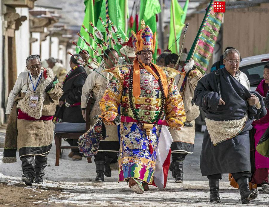 2019年2月18日拍攝于甘肅甘南藏族自治州的碌曲縣西倉寺。西倉寺位于青藏高原北部甘肅甘南藏族自治州的碌曲縣,每年農(nóng)歷正月十四都要在西倉寺舉行“亮寶”的民俗活動,以敬畏大自然和祈福來年吉祥。輪流做莊的藏族部落所有男丁都要參加,他們身著華麗藏服跟隨“戰(zhàn)神”巡游,藏族男子手握“長矛”、彩色經(jīng)幡和旌旗列隊,浩浩蕩蕩,女子則珠光寶氣,各個光彩照人,濃郁的藏民族風(fēng)情撲面而來。[攝影:王安芹]