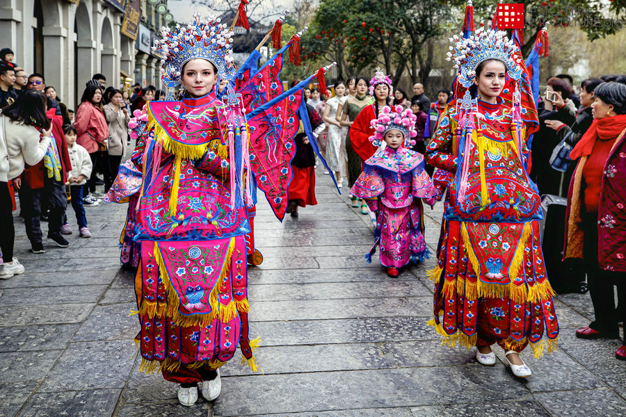 2019年3月9日拍攝于山東省棗莊市臺(tái)兒莊古城。兩位外國(guó)姑娘出現(xiàn)在春節(jié)民俗表演的隊(duì)伍中,她倆一身中國(guó)元素,儀態(tài)和神情流露出了對(duì)中國(guó)文化、中國(guó)元素、中國(guó)習(xí)俗的熱愛之情。[攝影:柴俊林]