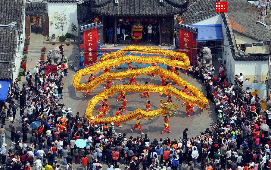 2018年4月29日拍攝于上海浦東三林老街。舞龍是三林和上海市非遺項(xiàng)目,每逢過(guò)年各種盛大文化慶?;顒?dòng)都少不了、都要進(jìn)行表演的保留節(jié)目。靈活多變的走勢(shì)和套路讓人們興致勃勃,拍手稱(chēng)贊。[攝影:郭廣齡]