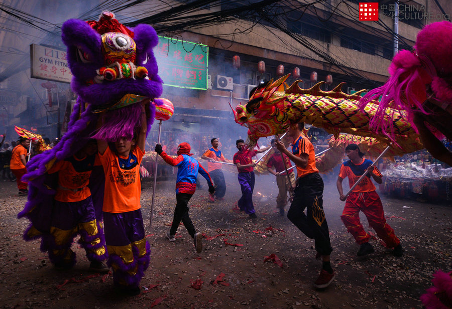 Photo taken in Manila, the Philippines on Jan 25, 2020. A Chinese version of Spider Man serves as the prime performer of the dragon and lion dance in front of commercial establishment along the street of Binondo in?Manila, the?Philippines. [Photo by Emman Asuncion Foronda] |