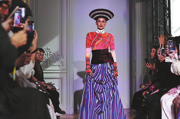 A model showcases clothing on Wednesday that blends the traditional craftsmanship of the Lisu ethnic group from China's Sichuan province with modern fashion elements, at the third Sino-French Fashion Week held at the China Cultural Center in Paris.