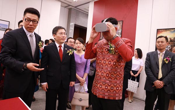 Chinese Ambassador in Thailand, Lyu Jian, second from left, accompanies Thai Minister of Culture Itthiphol Kunplome, second from right, in testing a VR device during the opening of the 14th China-Thailand Film Festival in Bangkok on Aug 24, 2019. [Photo/Chinaculture.org]