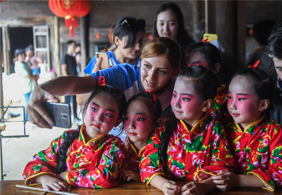 A woman from Armenia poses in a photo with young performers from a kindergarten in Xiaopu town, Changxing county, Zhejiang province, Sept 11, 2019. [Photo/Xinhua]