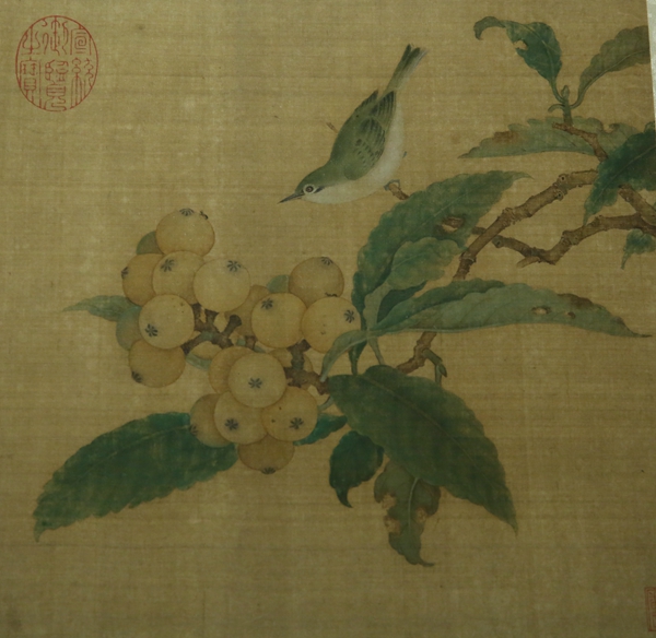 Floral-themed artifacts displayed at the Palace Museum in Beijing-a Song Dynasty (960-1279) painting on loquats and a bird.[Photo by Jiang Dong/China Daily]