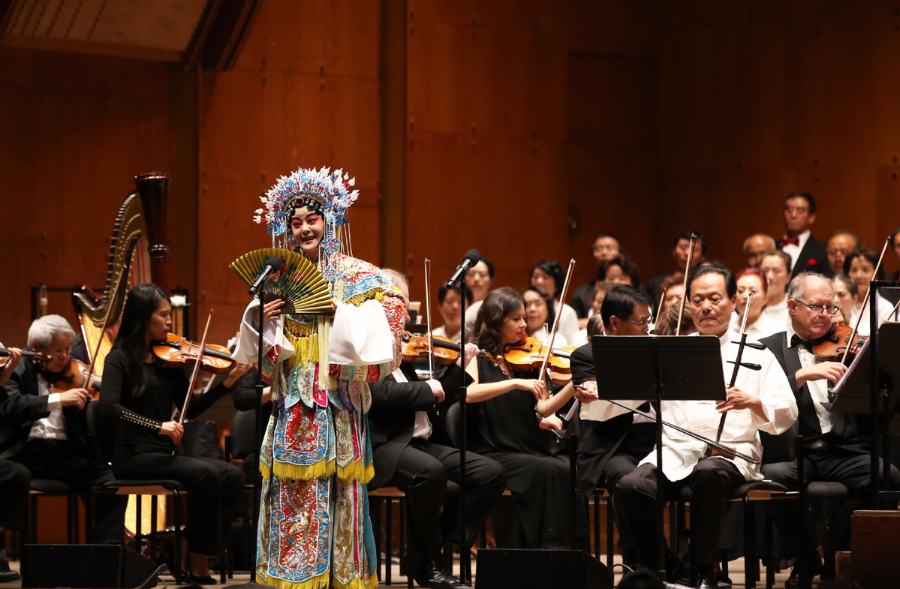 Artist Yang Ling (Front) performs "Ode to Pear Blossom" during the Symphonic Concert of Centennial Classics in Lincoln Center, New York, the United States, on Sept 15, 2019. The concert was staged here on Sunday to mark the 70th anniversary of the founding of the People's Republic of China and the 40th anniversary of the establishment of China-US diplomatic relations.[Photo/Xinhua]