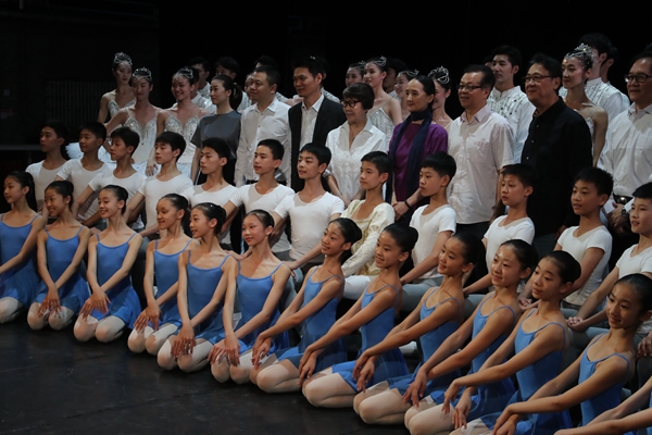 Teachers and students from the dance school affiliated with the National Ballet of China pose for a group photo at a news conference for the 60th anniversary of the company on Sept 19 in Beijing.[Photo provided to China Daily] |