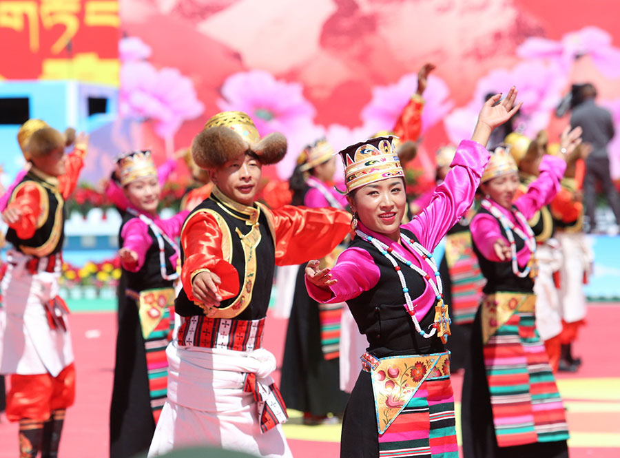 Performers dance in front of Potala Palace in Lhasa on Sunday during a celebration marking the People's Republic of China's 70th anniversary.[Photo by Palden Nyima/chinadaily.com.cn]