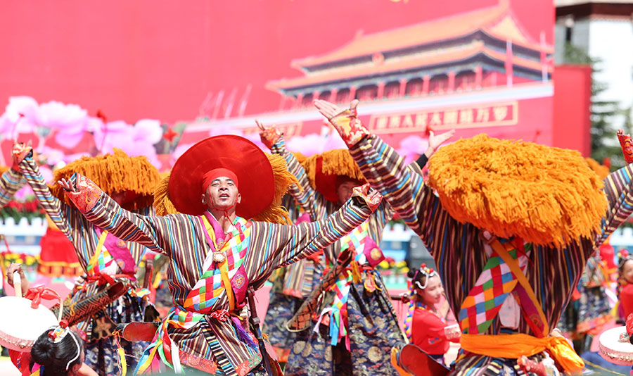 Performers dance in front of Potala Palace in Lhasa on Sunday during a celebration marking the People's Republic of China's 70th anniversary. [Photo by Palden Nyima/chinadaily.com.cn]