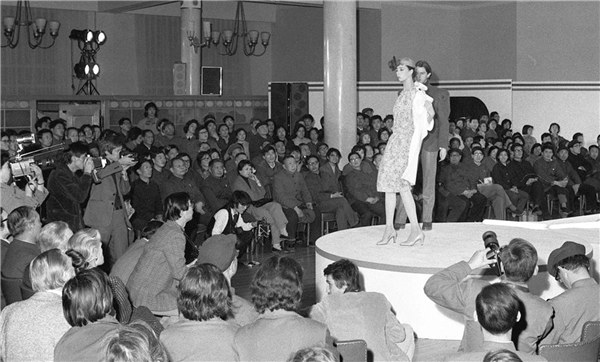 French models, led by designer Pierre Cardin, take to the catwalk at China's first fashion show at the Cultural Palace of Nationalities in Beijing in March 1979. [Photo/Xinhua] |