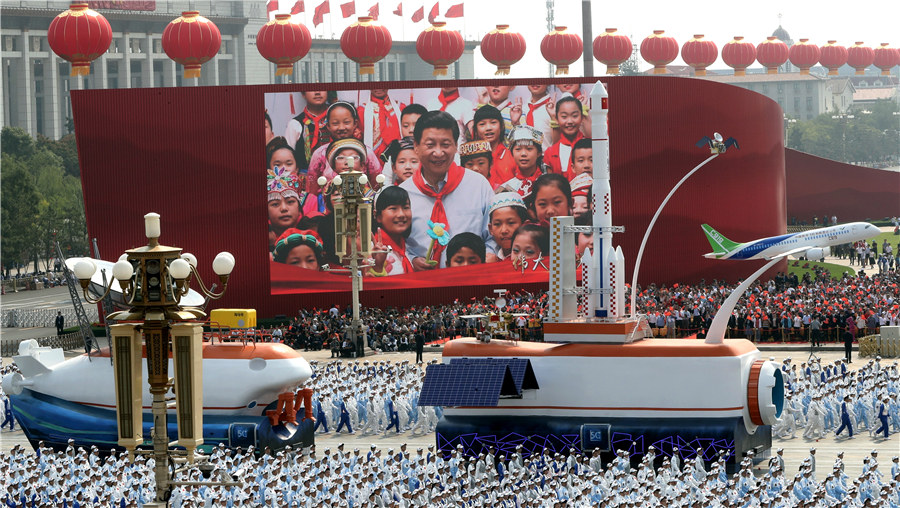 Innovation is an important theme in the mass pageantry during the celebrations marking the 70th anniversary of the founding of the People's Republic of China in Beijing on Tuesday. [Photo by Xu Jingxing/China Daily]
