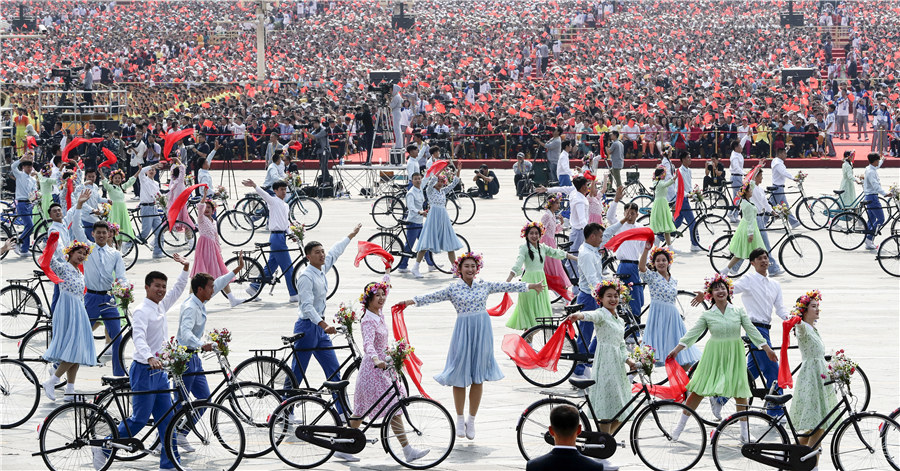 Young people display their youthful energy on bicycles in the parade celebrating the 70th anniversary of the founding of the People's Republic of China at Tian'anmen Square in Beijing on Tuesday. [Photo by Feng Yongbing/China Daily]
