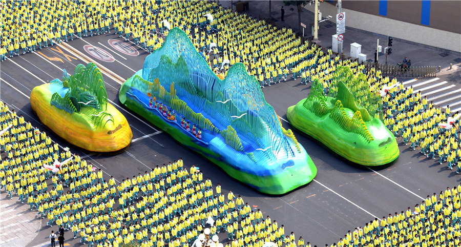 A formation extolling China's green efforts is featured as part of the mass pageantry during celebrations marking the 70th anniversary of the founding of the People's Republic of China in Beijing. [Photo by Li Yibo/Xinhua]