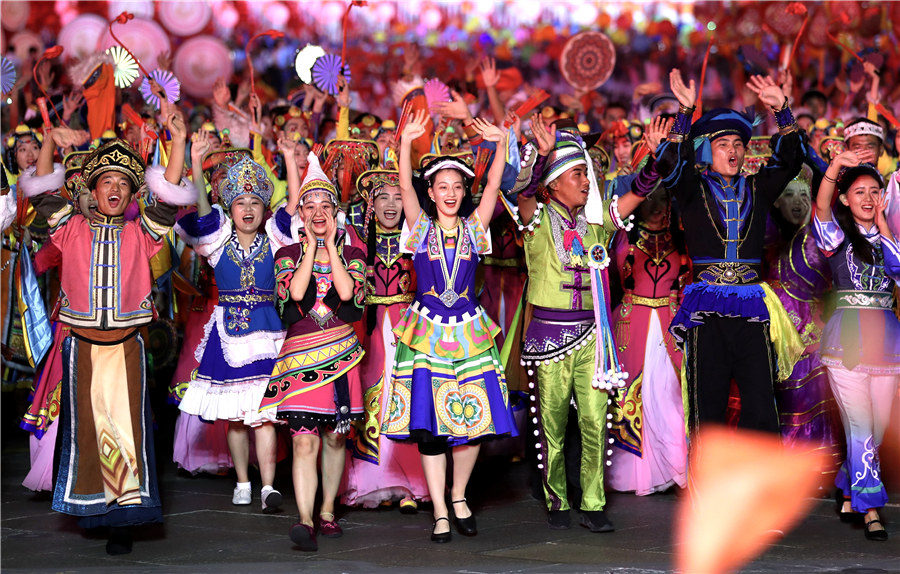 Ethnic groups, dressed in traditional clothing, take part in the evening gala to mark the 70th anniversary of the founding of the People's Republic of China on Tuesday in Beijing. [Photo by Zou Hong/China Daily]