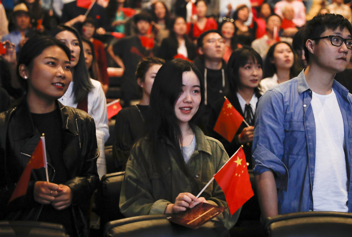 Overseas Chinese sing the theme song of the movie My People, My Country at its premiere in San Francisco on Monday. [Photo/Xinhua] |