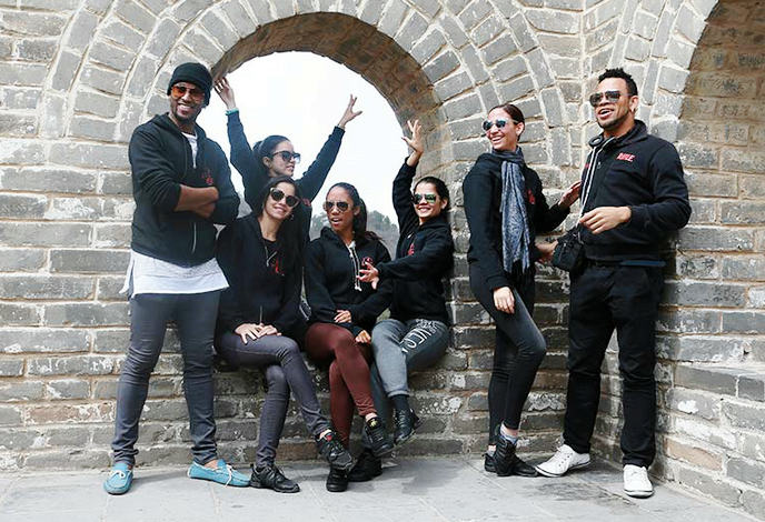 Members of Lizt Alfonso Dance Cuba, a Cuban dance troupe, pose for photos on the Badaling section of the Great Wall northwest of Beijing on Monday.