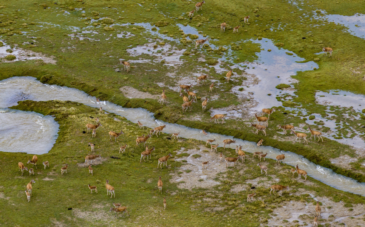 This aerial drone photo shows Tibetan antelopes crossing the Senlong Zangbo River in Changtang National Nature Reserve in Southwest China's Xizang autonomous region, July 14, 2025. [Photo/Xinhua]