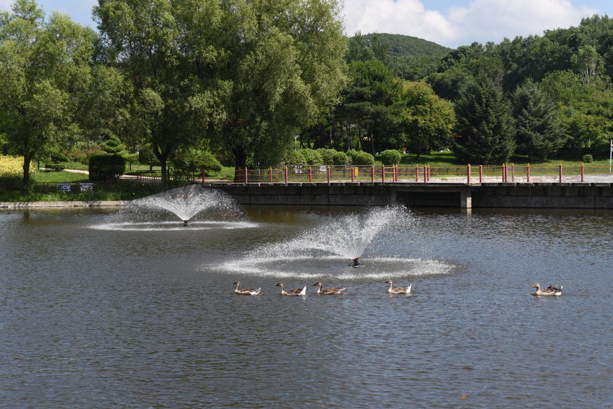 Artificial fountains bring coolness to the swans at the Harbin Northern Forest Zoo in Heilongjiang province. [Photo by Liu Xiaomi/For chinadaily.com.cn]