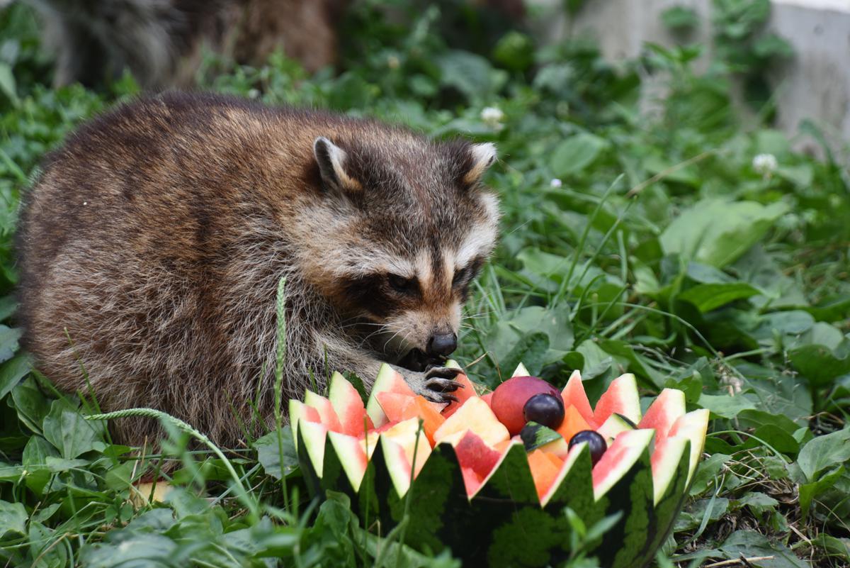 A raccoon beats the heat with frozen fruit at the Harbin Northern Forest Zoo in Heilongjiang province. [Photo by Liu Xiaomi/For chinadaily.com.cn]