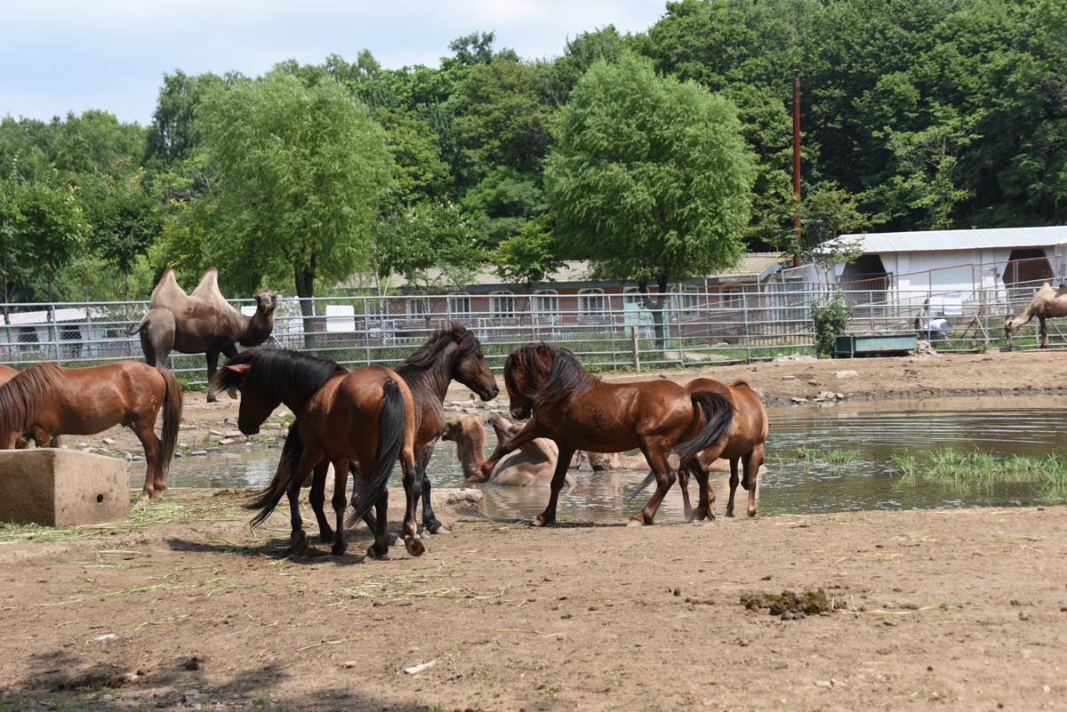 Camels and ponies cool off in water at the Harbin Northern Forest Zoo in Heilongjiang province. [Photo by Liu Xiaomi/For chinadaily.com.cn]