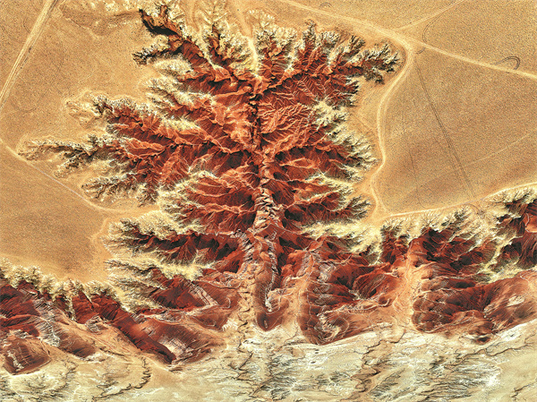 Viewing from high above, the fiery-red Danxia cliffs with rugged rims, sculpted by erosion over millions of years, resemble the earth's blood vessels. Standing at the edge of the cliffs, where the wind howled in my ears and almost knocked me down, various shades of red from the cliffs came into view, and I came to appreciate the dwarfed yet tenacious shrubs on that desolate tableland.