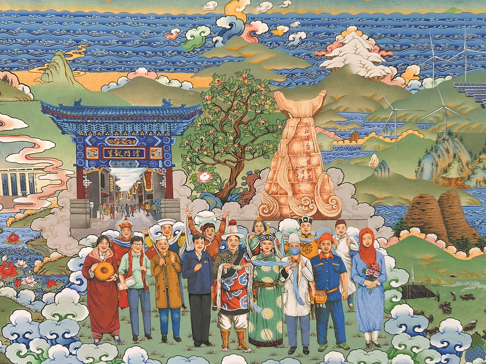 One of them depicts landmark landscapes and buildings, including Tianjin's Panshan Mountain and Qinghai's Sanjiangyuan National Park, as well as scenes of Tianjin's educational and medical assistance to Qinghai. The other one shows the sister regions of Qinghai's Huangnan Tibetan autonomous prefecture and Tianjin's Binhai New Area and their natural and cultural landmarks.