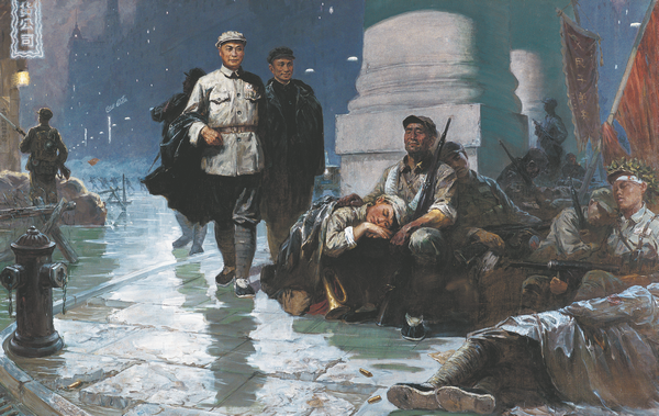 Rendered in layers of gray, the canvas depicts soldiers resting in the streets under neon lights, careful not to disturb residents. Walking among them are commanders Chen Yi and Su Yu, gazing at their exhausted troops with pride.