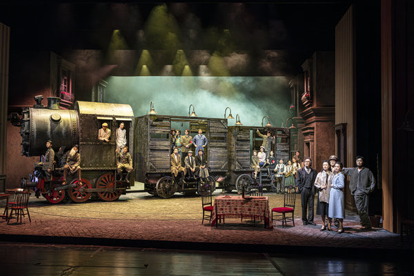 One of the most striking elements is a full-scale vintage steam train — a locomotive with two carriages attached, that dominates the stage. The set allows the train to move and rotate along the stage's vertical space. Whenever it emerges, slowly creeping from the wings or looming in the back, it casts a chilling sense of oppression, echoing the fear and instability that war stamped into people's hearts.