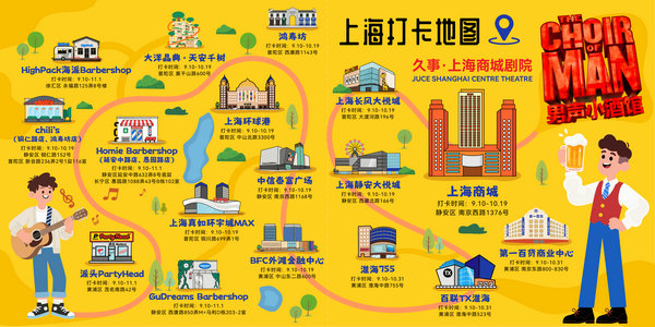 "We aim to use ticket stubs as a link to connect cultural consumption with urban life scenarios, making post-show experiences more rewarding and allowing the warm atmosphere of the musical to reach more corners of the city," said a representative from Jiushi Culture. The campaign collaborates with 17 premium merchants across Jing'an, Huangpu and Putuo districts, launching a Shanghai check-in map themed on The Choir of Man, which includes locations such as Shanghai Centre, CITIC Square, The One Mall under Bailian Group, Huaihai 755, TX Huaihai and Shanghai Global Harbor.