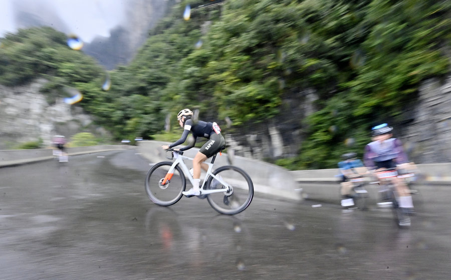 International competitors race in a bike challenge on a cliffside road on Sunday in Tianmen Mountain scenic area of Zhangjiajie, Hunan province. [Photo by Tuo Liang/For chinadaily.com.cn]