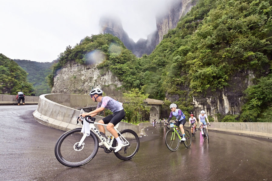 International competitors race in a bike challenge on a cliffside road on Sunday in Tianmen Mountain scenic area of Zhangjiajie, Hunan province. [Photo by Tuo Liang/For chinadaily.com.cn]
