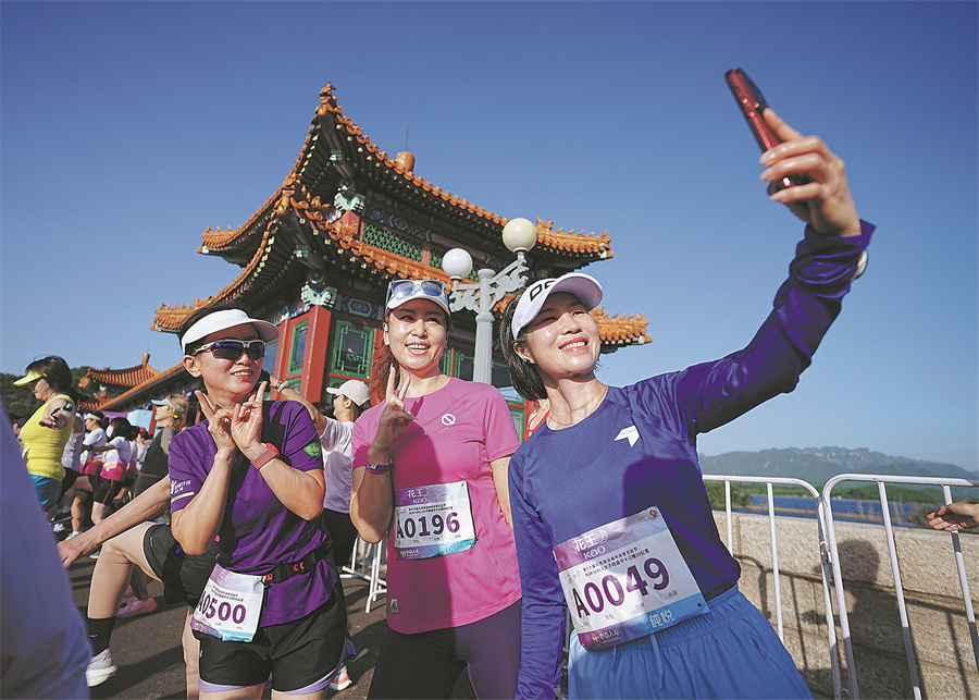 Run Girls, a special 10-kilometer running event for women, kicks off along the scenic Ming Tombs Reservoir in Changping district in Beijing. Runners take selfies, pose together for group photos, and wave to the audience during the event. [Photo provided to China Daily]