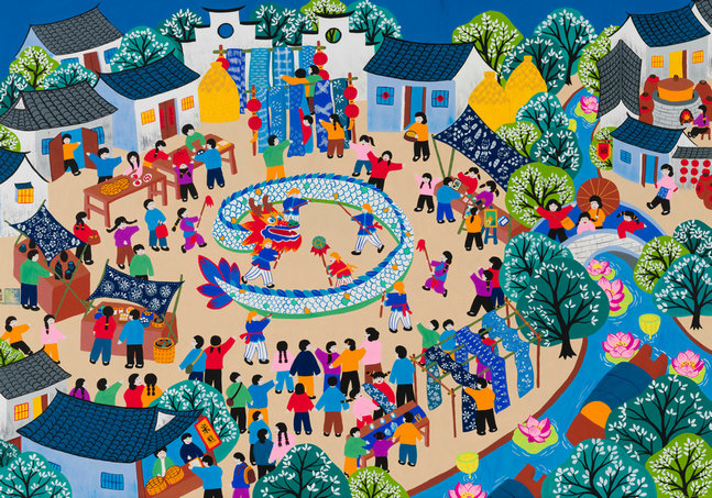 On-site, standout works from across China showcase diverse regional charm. Some depict the scenery of Zhuang villages in the Guangxi Zhuang autonomous region, others capture the lively scenes of the traditional Tibetan New Year with rich and vibrant colors, and representative Jinshan farmers paintings use simple brushwork to portray the many facets of life.