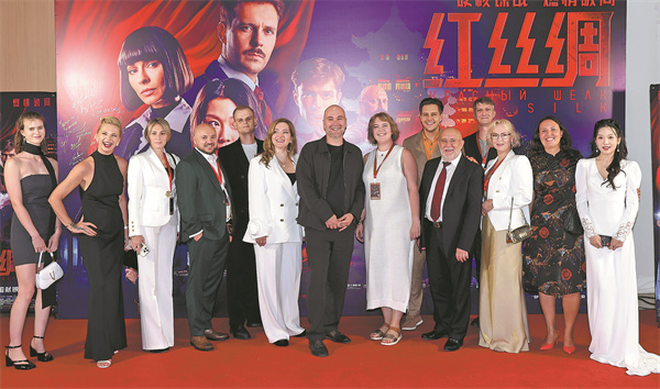 The espionage film Red Silk held the premiere in Beijing, gathering cast and crew members including director Andrey Volgin (center) and actress Zheng Hanyi (far right). [Photo provided to China Daily]