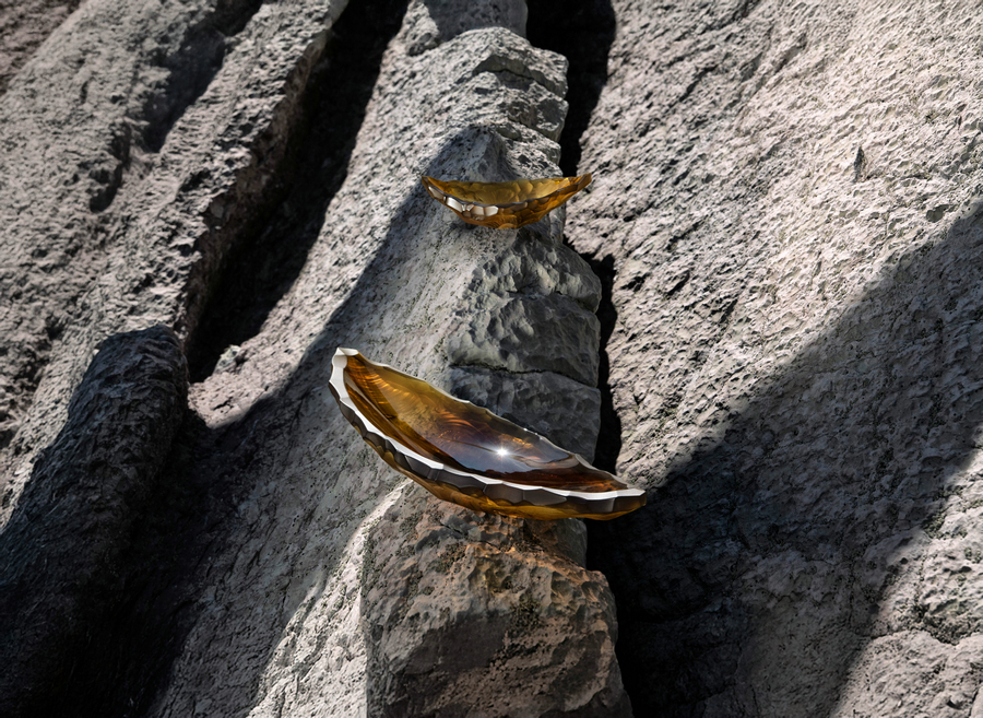 Bowls and cups from French luxury brand Lalique's Terramineral II series present the inspiration of the raw surfaces of the ground and rocks and the ever-changing natural landscapes.[Photo provided to chinadaily.com.cn]