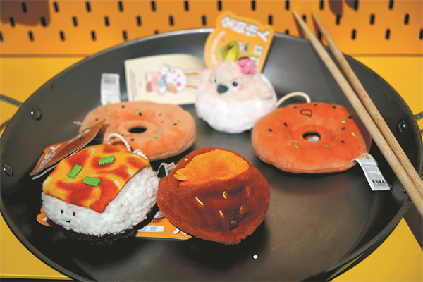 Plush toys modeled after Wuhan's local snacks and an iconic bird. [Photo by Xu Lin/China Daily]
