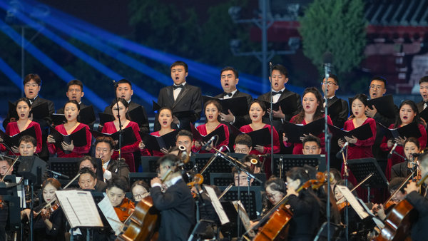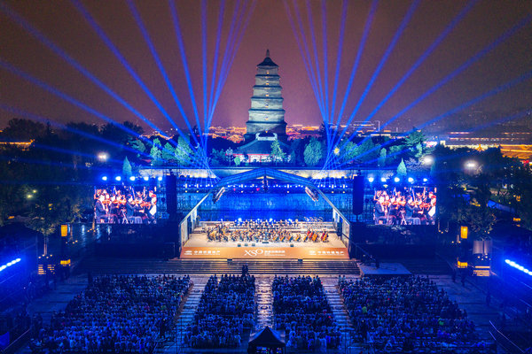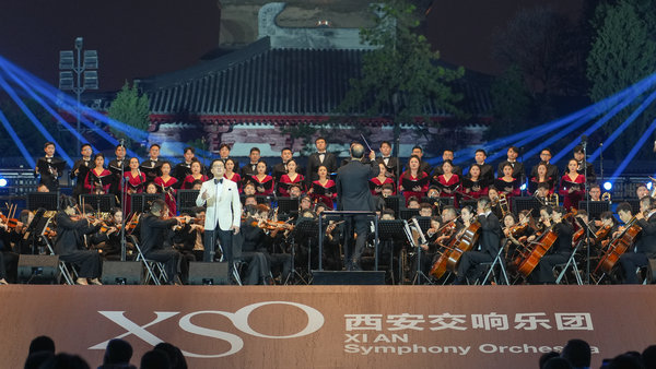 The Xi'an Symphony Orchestra's outdoor concert at the Giant Wild Goose Pagoda, a historical landmark in Xi'an, Shaanxi province, was staged on Sept 20.