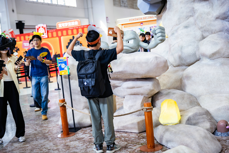 A visitor poses for pictures in front of a Pokemon installation outside the venue.[Photo provided to chinadaily.com.cn]
