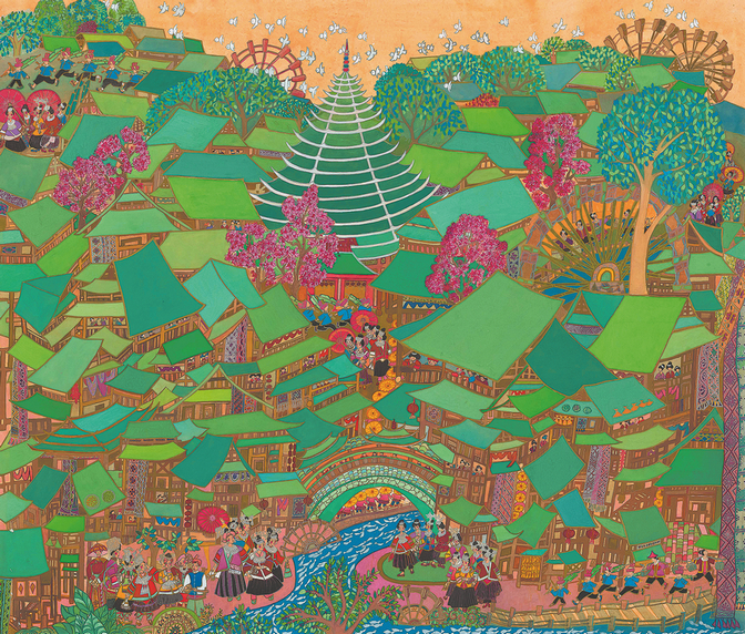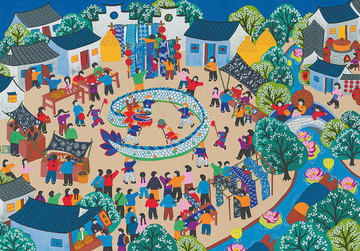 Other works from the Yangtze River Delta region use delicate, detailed brushwork to depict life in a water town — farmers planting rice beside stone bridges, fishermen returning with their catch at sunset — while paintings from northwest villages are usually explosions of bold, vivid colors that reflect the region's vibrant folk customs.