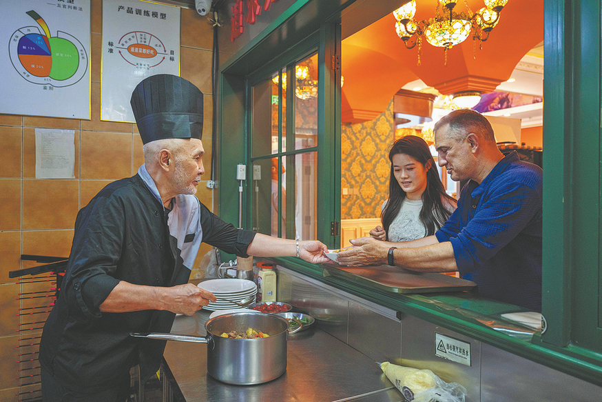 Saulebek Kabylbekov (left) serves Kazakh dishes he cooked to colleagues at the canteen of Daqing Ophthalmology Hospital in Daqing city, Northeast China's Heilongjiang province, July 16, 2025. ZHANG TAO/XINHUA