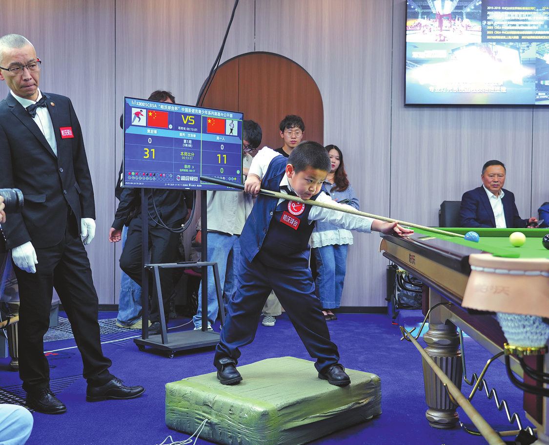 Wu Yiren, a six-year-old from a kindergarten in Dalang township, Dongguan, Guangdong province, has gained online fame for his passion for snooker. Too short to reach the table, he often brings a custom-made height booster to competitions — an endearing sight that has quickly won hearts online.