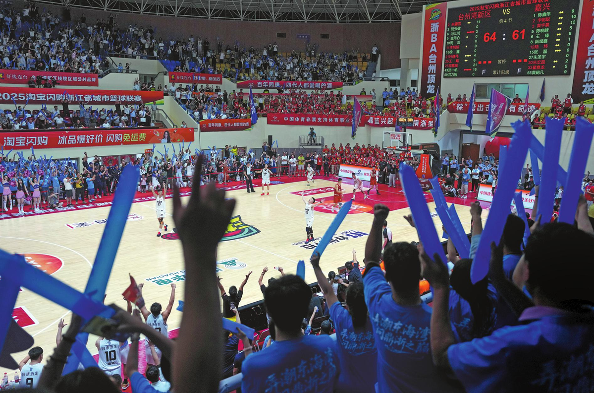 Players of team Taizhou celebrate winning the ZheBA, or the Zhejiang Provincial City Basketball League, against team Jiaxing in Taizhou, East China's Zhejiang province. HUANG ZONGZHI/XINHUA