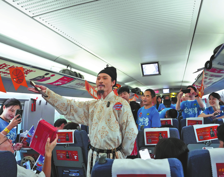 More than 60 fans boarded the dedicated train to attend a provincial league game, with passengers donning team jerseys and carrying banners. The carriage was decorated with flags and motivational slogans in anticipation of the evening match between Taizhou and Jiaxing.